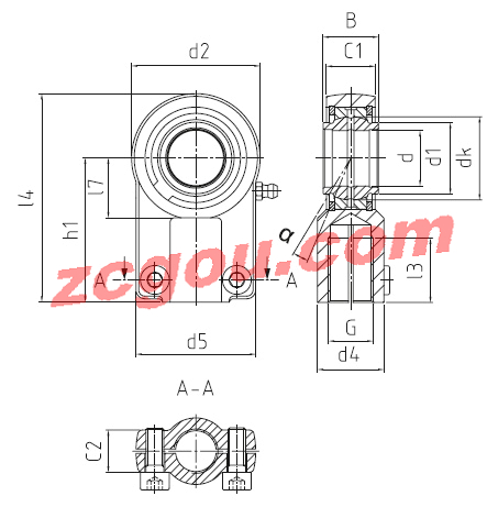 | type | d (mm) | d1 (mm) | d2 (mm) | d4 (mm) | d5 (mm) | dk (mm) | G | B (mm) | C1 (mm) | C2 (mm) | l3 (mm) | l7 (mm) | l4 (mm) | h1 (mm) | tilt angle alpha (°) | weight (kg) | basic load rating dyn C (kN) | basic load rating stat Co (kN) | radial clearance CN (?m) | d (mm) |